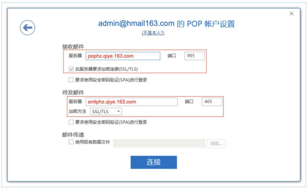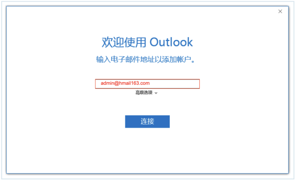 第二步:输入完整的邮箱帐号,点击连接。