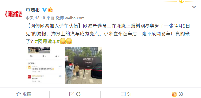 网易员工爆料,一辆蒙有黑布的汽车于今日停放于公司园区大门口,根据车型和海报猜测该汽车为德国豪车品牌迈巴赫。海报印有“4月9日见”字样和网易严选logo,一时间,“网易造车”、“网易进军汽车领域”传闻四起。