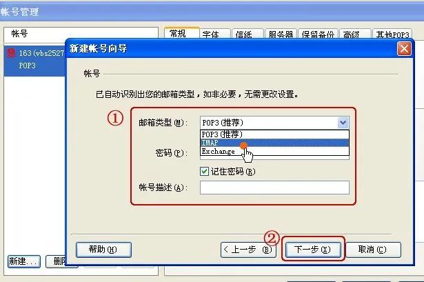 4、在此页面选择您新建邮箱的类型(选择IMAP),输入“密码”和“帐号描述”后点“下一步”;