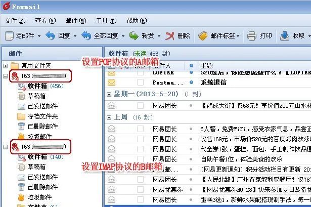 6、设置完毕后,Foxmail邮箱上显示两个邮箱帐号,分别是之前通过POP协议设置收走了邮件的A邮箱,以及刚设置IMAP协议来恢复邮件的B邮箱;