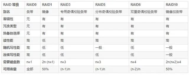 RAID 等级的选择主要有三个因素,即数据可用性、 I/O 性能和成本。 目前,在实际应用中常见的主流 RAID 等级是 RAID0 , RAID1 , RAID5 , RAID6 和 RAID10 ,它们之间的技术对比情况如下表所示。