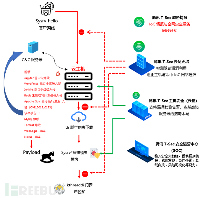 腾讯安全威胁情报中心检测到Sysrv-hello僵尸网络近期十分活跃,该僵尸网络具备木马、后门、蠕虫等多种恶意软件的综合攻击能力。