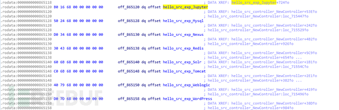 分析样本后发现,Sysrv-hello僵尸网络木马当前版本代码结构相对以往版本变化较大,样本行为层除增加端口反调试、使用的基础设施更新之外。其入侵方式也增加了5种,除去之前使用的Mysql爆破,Tomcat爆破,Weblogic漏洞利用,Nexus弱口令命令执行漏洞利用外。新增以下5种组件的入侵攻击。