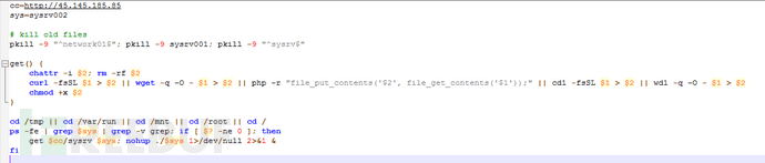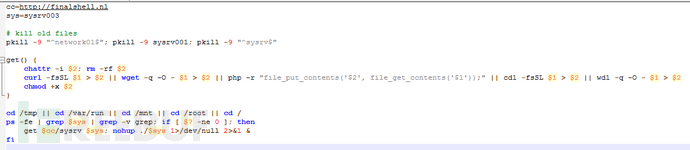 入侵成功后植入shell脚本执行恶意命令,脚本进一步拉取sysrv蠕虫扩散模块,分析过程种捕获到两个恶意文件托管地址,hxxp://finalshell.nl,hxxp://45.145.185.85,对应sysrv蠕虫模块分别命名为sysrv002,sysrv003,可见该蠕虫更新频繁。