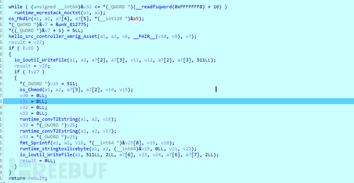 病毒当前投递最终载荷依然为挖矿木马,sysrv模块会在其Guard守护流程内对挖矿进程做保护,当kthreaddi进程不存在,则释放矿机到tmp目录下的随机目录内,并将其运行,随后会将本地矿机文件进行删除。